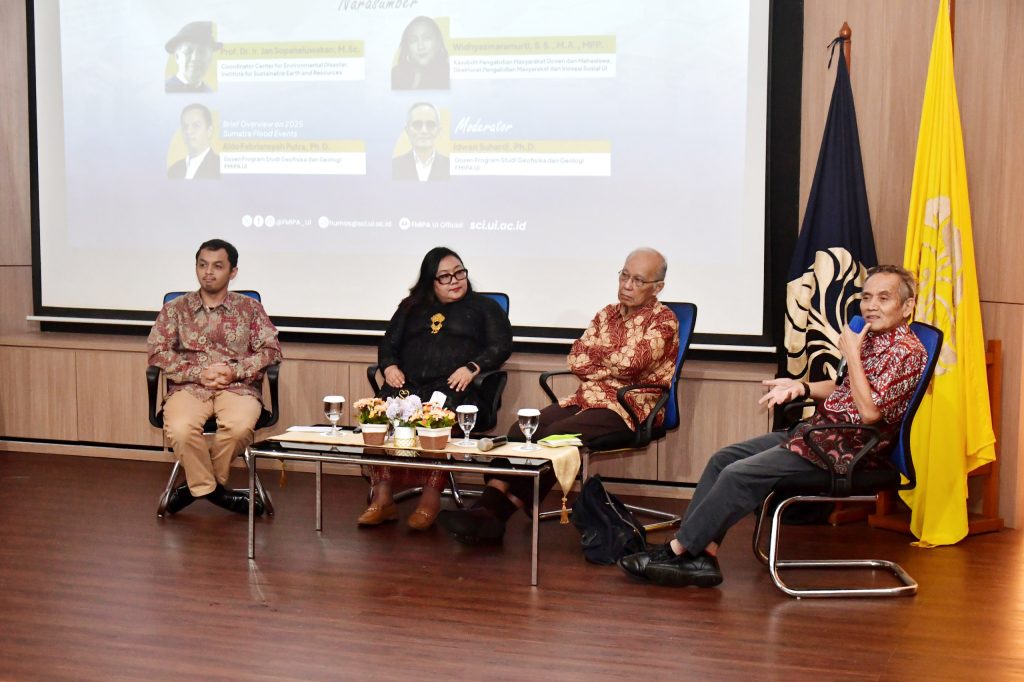 Diskusi menyoroti bencana di Sumatra dari sudut pandang keilmuan, termasuk faktor geomorfologi dan aktivitas manusia yang memicu banjir di Aceh, Sumatra Utara, dan Sumatra Barat, serta kontribusi Universitas Indonesia melalui program UI Peduli sebagai wujud aksi kemanusiaan. Kuliah umum dimoderatori Idwan Suhardi, Ph.D., pakar Coastal Geomorphology FMIPA UI.