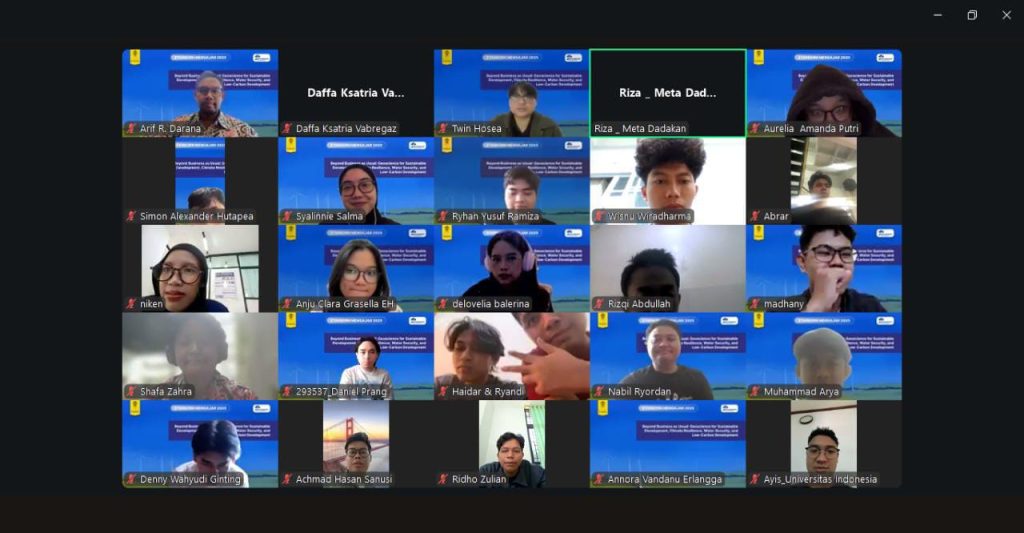Dalam upaya memperkaya wawasan mahasiswa terkait isu-isu lingkungan dan tantangan pembangunan berkelanjutan, Fakultas Matematika dan Ilmu Pengetahuan Alam Universitas Indonesia (FMIPA UI) melalui Program Studi Geosains menggelar UI Geosciences Seminar X Starborn Mengajar bertema “Beyond Business as Usual: Geoscience for Sustainable Development, Climate Resilience, Water Security, and Low-Carbon Development”. Acara yang berlangsung secara daring pada Senin, 24 November 2025, ini diikuti oleh 80 mahasiswa dari Program Studi Geologi dan Geofisika.