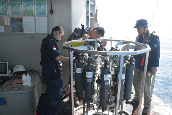 Peneliti mengambil sampel air dari Rosette Water Sampler dari kedalaman 1300m